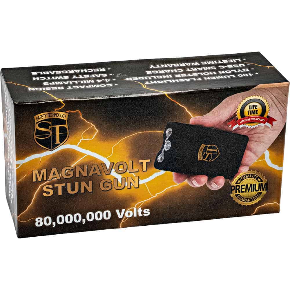 The MAGNAVOLT Stun Gun Flashlight. Features include 80 Million Volts, Squared Compact Design, 100-Lumen LED, Rechargeable, Nylon Holster, Lifetime Warranty.